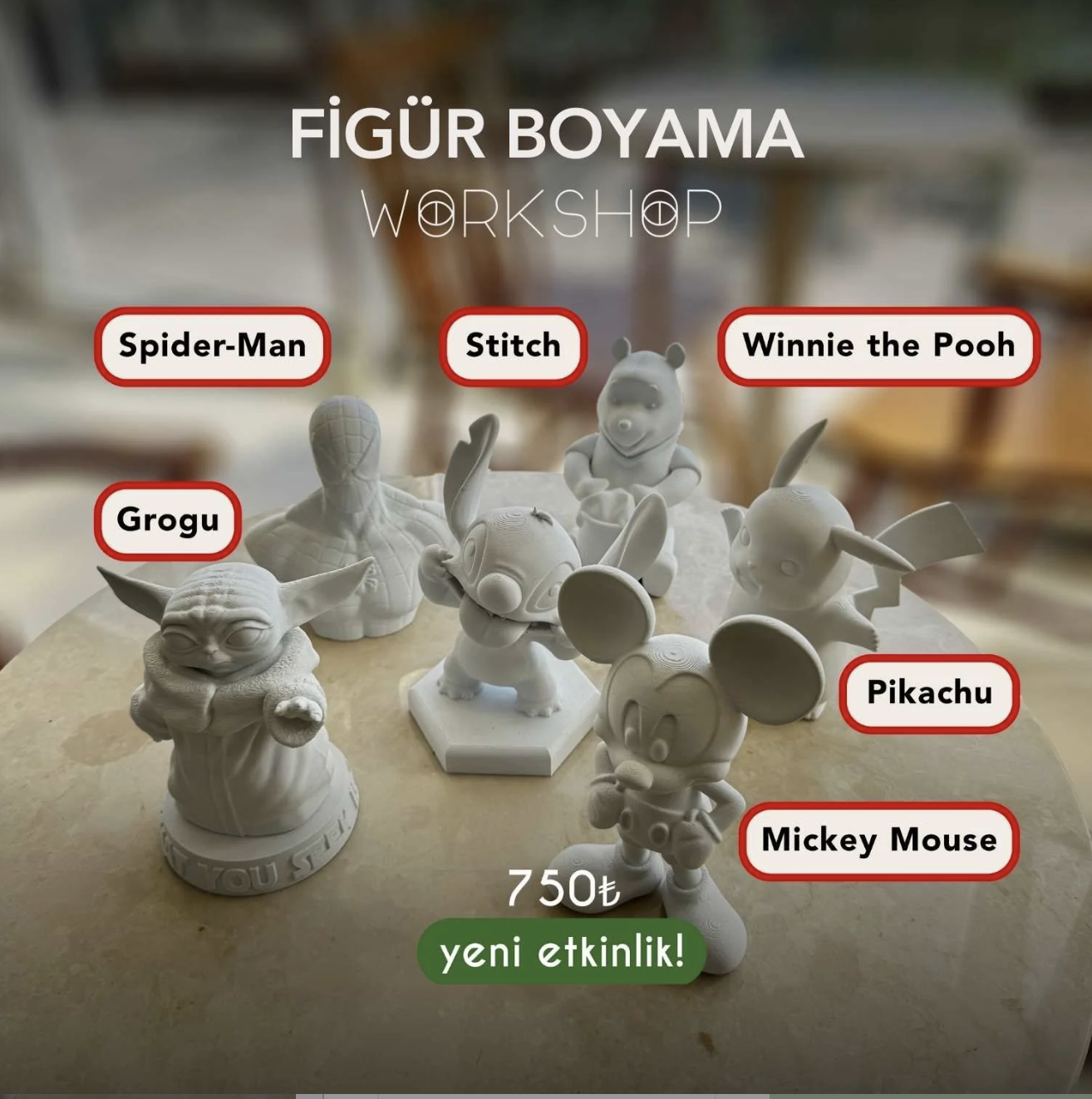 Spider-Man, Grogu, Stitch, Winnie the Pooh, Pikachu ve Mickey Mouse figürlerinden seçtiğiniz birini kendi tarzınızla dilediğiniz renklerle boyayarak bambaşka bir dünyaya adım atın. Dilediğiniz figür çeşidini, etkinlik alanını ve oturumu seçebilir, biletinizi alabilirsiniz. Her etkinliğimizde olduğu gibi biten çalışmanız sizde kalacak, bu etkinliği hatırlatan şahane bir anı olacak! Şimdiden iyi eğlenceler.
