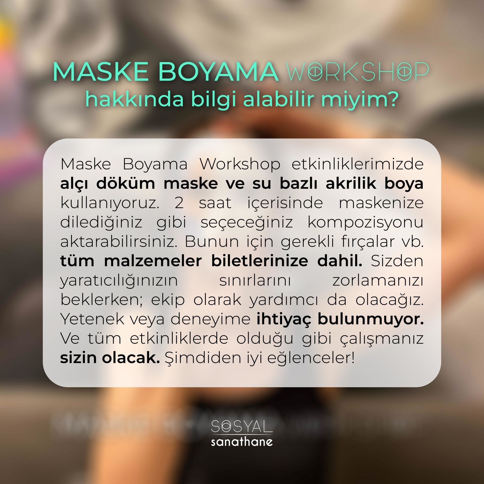 Maske Boyama Workshop etkinliklerimizde alçı döküm maske ve su bazlı akrilik boya kullanıyoruz. 2 saat içerisinde maskenize dilediğiniz gibi seçeceğiniz kompozisyonu aktarabilirsiniz. Bunun için gerekli fırçalar vb. tüm malzemeler biletlerinize dahil. Sizden yaratıcılığınızın sınırlarını zorlamanızı beklerken; ekip olarak yardımcı da olacağız. Yetenek veya deneyime ihtiyaç bulunmuyor. Ve tüm etkinliklerde olduğu gibi çalışmanız sizin olacak. Şimdiden iyi eğlenceler! Sevgiler.