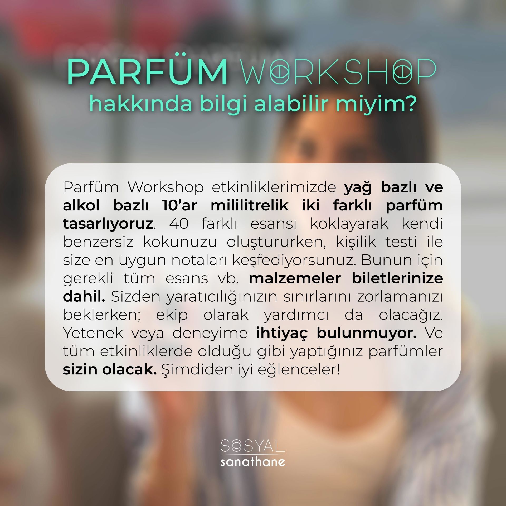 Doğal Parfüm Workshop etkinliklerimizde yağ bazlı ve alkol bazlı 10’ar mililitrelik iki farklı parfüm tasarlıyoruz. 40 farklı esansı koklayarak kendi benzersiz kokunuzu oluştururken, kişilik testi ile size en uygun notaları keşfediyorsunuz. Bunun için gerekli tüm esans vb. malzemeler biletlerinize dahil. Sizden yaratıcılığınızın sınırlarını zorlamanızı beklerken; ekip olarak yardımcı da olacağız. Yetenek veya deneyime ihtiyaç bulunmuyor. Ve tüm etkinliklerde olduğu gibi yaptığınız parfümler sizin olacak. Şimdiden iyi eğlenceler! Sevgiler.