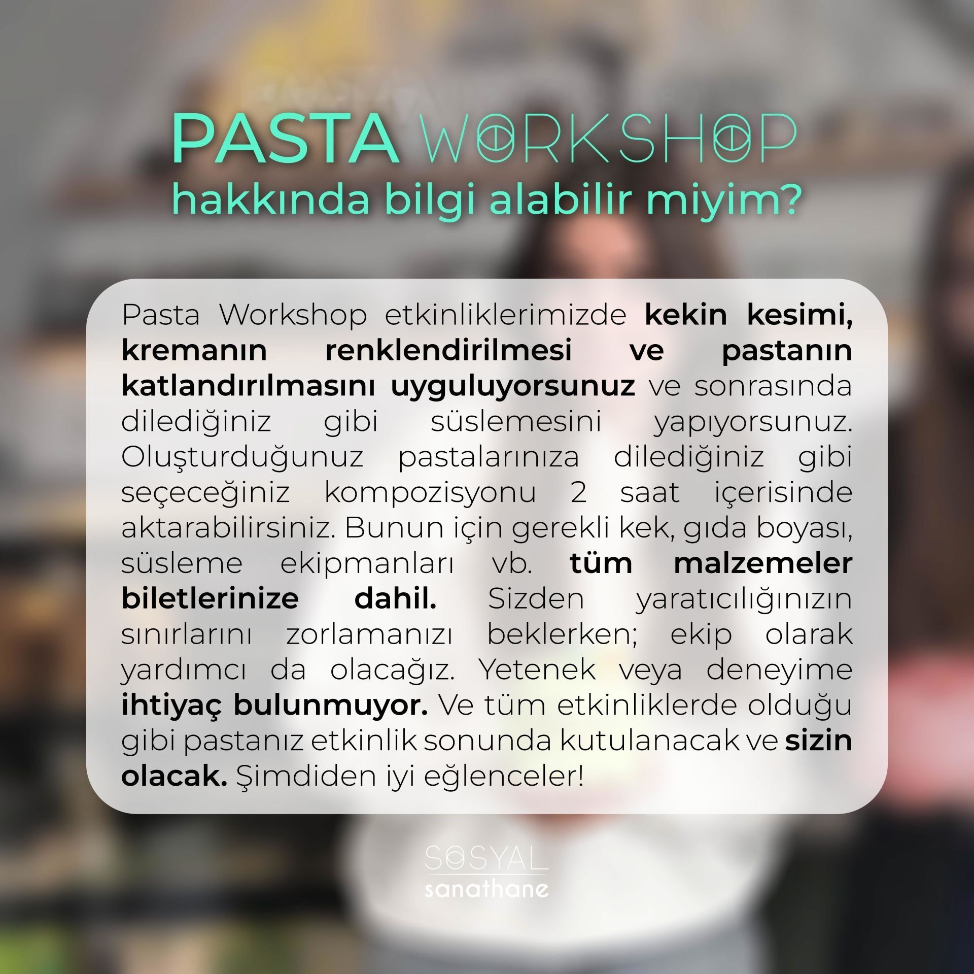 Pasta Workshop etkinliklerimizde kekin kesimi, kremanın renklendirilmesi ve pastanın katlandırılmasını uyguluyorsunuz ve sonrasında dilediğiniz gibi süslemesini yapıyorsunuz. Oluşturduğunuz pastalarınıza dilediğiniz gibi seçeceğiniz kompozisyonu 2 saat içerisinde aktarabilirsiniz. Bunun için gerekli kek, gıda boyası, süsleme ekipmanları vb. tüm malzemeler biletlerinize dahil. Sizden yaratıcılığınızın sınırlarını zorlamanızı beklerken; ekip olarak yardımcı da olacağız. Yetenek veya deneyime ihtiyaç bulunmuyor. Ve tüm etkinliklerde olduğu gibi pastanız etkinlik sonunda kutulanacak ve sizin olacak. Şimdiden iyi eğlenceler! Sevgiler.