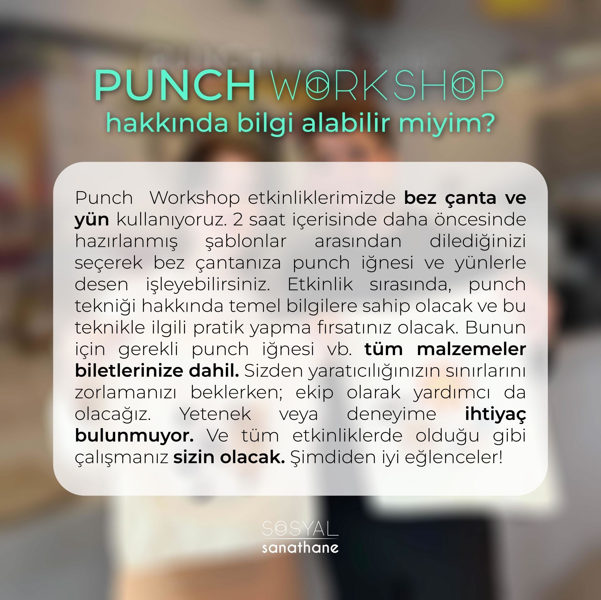 Punch Workshop etkinliklerimizde bez çanta ve yün kullanıyoruz. 2 saat içerisinde daha öncesinde hazırlanmış şablonlar arasından dilediğinizi seçerek bez çantanıza punch iğnesi ve yünlerle desen işleyebilirsiniz. Etkinlik sırasında, punch tekniği hakkında temel bilgilere sahip olacak ve bu teknikle ilgili pratik yapma fırsatınız olacak. Bunun için gerekli punch iğnesi vb. tüm malzemeler biletlerinize dahil. Sizden yaratıcılığınızın sınırlarını zorlamanızı beklerken; ekip olarak yardımcı da olacağız. Yetenek veya deneyime ihtiyaç bulunmuyor. Ve tüm etkinliklerde olduğu gibi çalışmanız sizin olacak. Şimdiden iyi eğlenceler! Sevgiler.