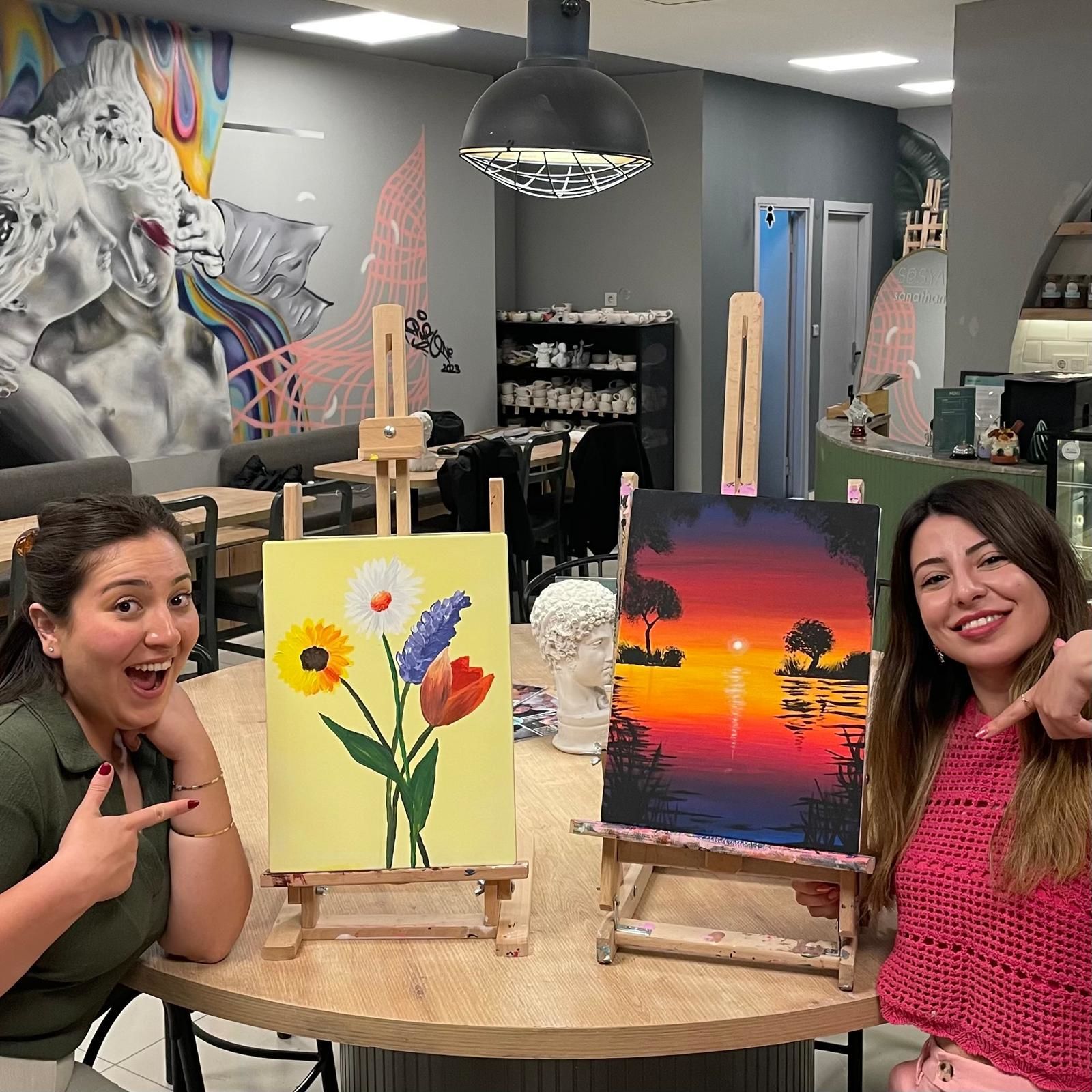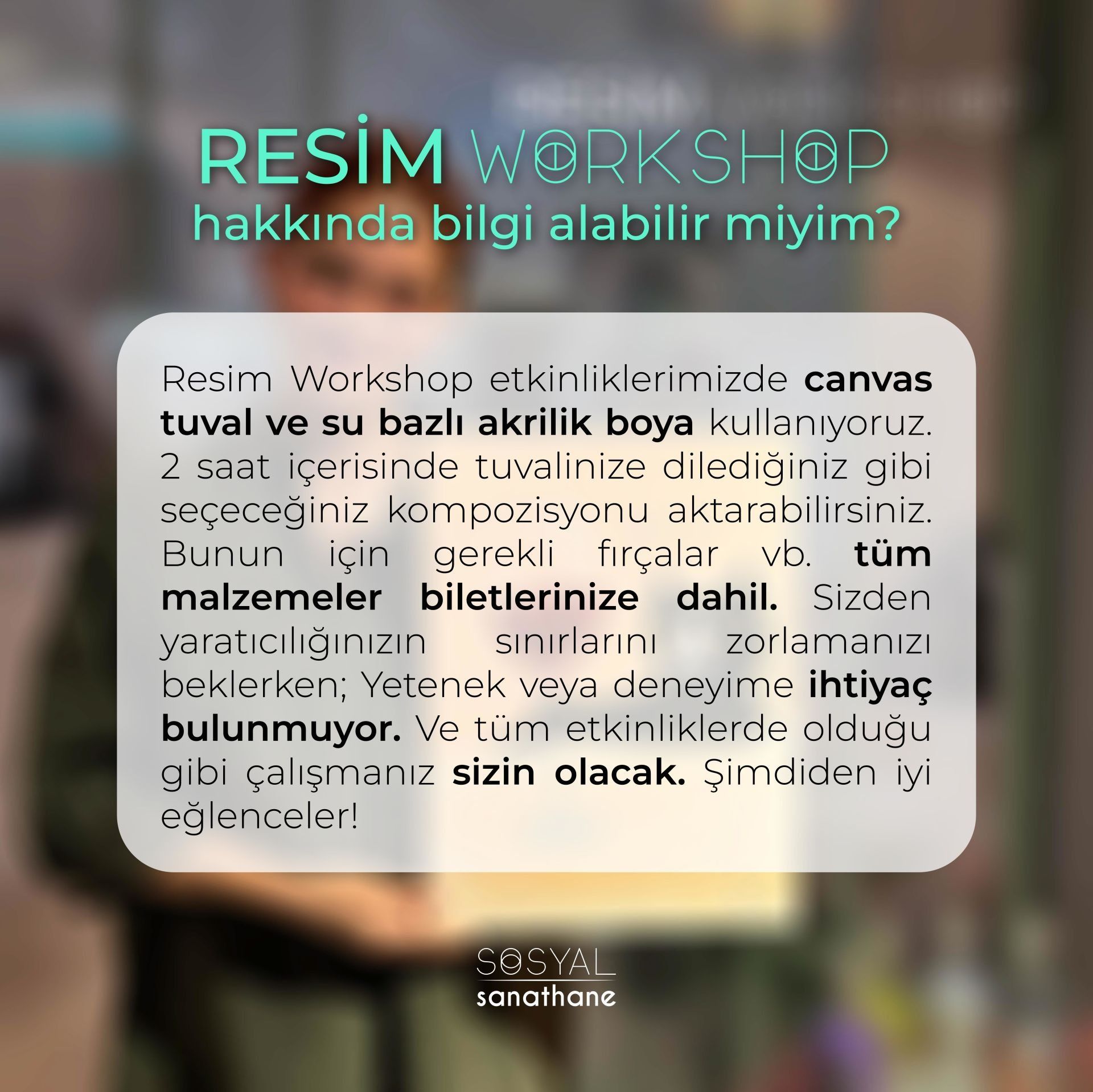 Resim Workshop etkinliklerimizde canvas tuval ve su bazlı akrilik boya kullanıyoruz. 2 saat içerisinde tuvalinize dilediğiniz gibi seçeceğiniz kompozisyonu aktarabilirsiniz. Bunun için gerekli fırçalar vb. tüm malzemeler biletlerinize dahil. Sizden yaratıcılığınızın sınırlarını zorlamanızı beklerken; Yetenek veya deneyime ihtiyaç bulunmuyor. Ve tüm etkinliklerde olduğu gibi çalışmanız sizin olacak. Şimdiden iyi eğlenceler! Sevgiler.